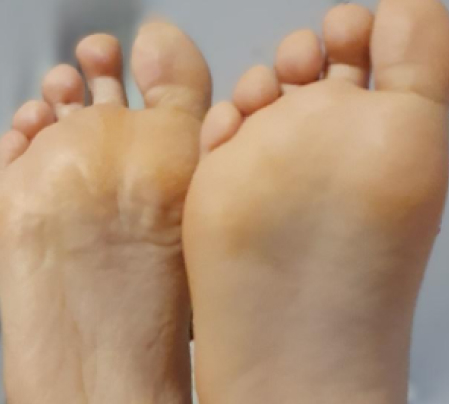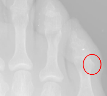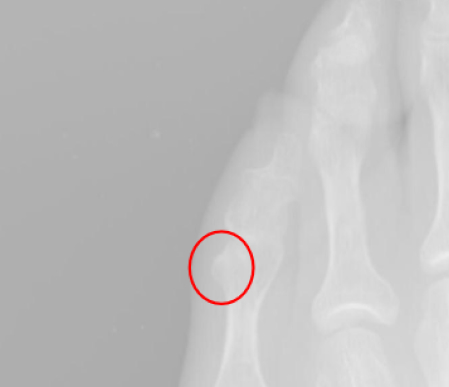 En las imágenes vemos osteofitos que en la piel generan un heloma dorsal del 5º dedo.